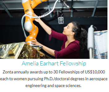 The deadline for submissions for the 2025 Award has passed. The Amelia Earhart Fellowship was established in 1938 in honor of famed pilot and Zontian, Amelia Earhart. The US$10,000 Fellowship is awarded annually to up to 30 women pursuing Ph.D./doctoral degrees in aerospace engineering and space sciences. The 2026 Application will be posted at zonta.org/AEFellowship.